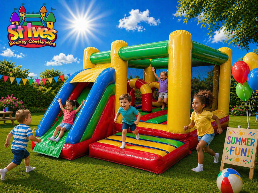 Make your next event a memorable one with our Toddler Bouncy Castle Hire. The Rainbow Front Slide Activity Castle in Huntingdon, St Ives, Cambridge, Hemingford, St Neots, Sawtry, Cambourne, and Northstowe is just a click away. Check availability or book online now using the easy-to-access buttons below. Let the fun begin! 🎶